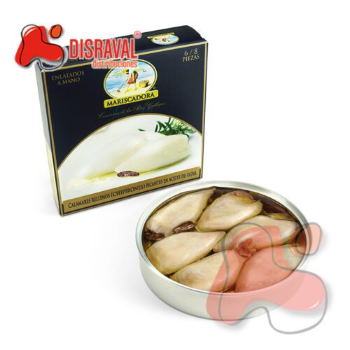 Calamares o chipirones rellenos con una mezcla suave de ajo y guindilla.